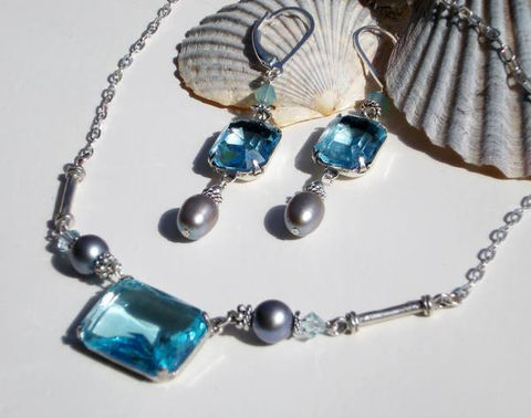 These designs are limited editions due to the fact that the glass is vintage. Each glass gem is of finite supply, and when a piece finishes there simply is no more. Vintage glass has, by its very nature, various nuances which reflect their individual character and unique appearance. These timeless jewelry designs are wearable collectibles.